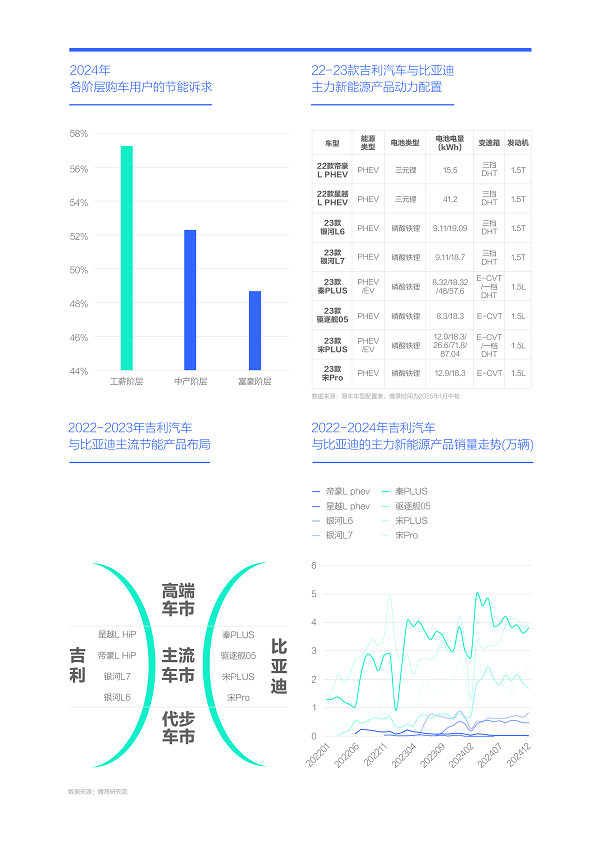 2021年起比亞迪之所以能快速崛起并強勢擠壓吉利汽車,主要受惠于聚焦工薪車市的秦PLUS、宋pro、宋PLUS等節(jié)能型產(chǎn)品。對比中產(chǎn)與富豪,工薪用戶的節(jié)能訴求最強烈,2024年高達(dá)57.26%。2021年吉利主銷產(chǎn)品也高度聚焦工薪車市,但燃油車占比95%以上,節(jié)能性遠(yuǎn)不如PHEV、EV等新能源產(chǎn)品,導(dǎo)致吉利汽車在與比亞迪的競爭中,快速失去“民心”;