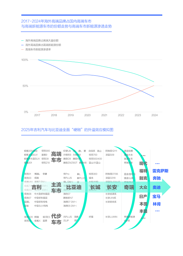 海外高端品牌占高端新能源份額跌破30%,吉利與比亞迪的全面“硬剛”與加速高端化,將大幅提升2025-2026年BBA的崩盤概率