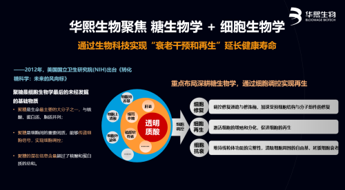 此外,依托在透明質(zhì)酸領(lǐng)域的長(zhǎng)期研究?jī)?chǔ)備和高效轉(zhuǎn)化能力,華熙生物開(kāi)始探索各類(lèi)聚糖對(duì)人類(lèi)健康的作用,如肝素、硫酸軟骨素、母乳寡糖、唾液酸、巖藻糖、葡聚糖等,并成功構(gòu)建糖庫(kù),為后續(xù)科研與應(yīng)用奠定基礎(chǔ)。同時(shí),布局細(xì)胞生物學(xué),探索細(xì)胞級(jí)抗衰,通過(guò)調(diào)控和優(yōu)化細(xì)胞種類(lèi)與功能,恢復(fù)組織和機(jī)體功能,提高生命質(zhì)量。