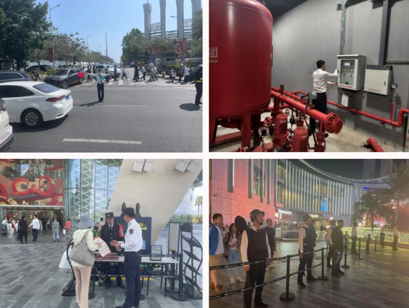 在停車場,他們指揮著過往的交通,疏導(dǎo)著擁堵的路段;在設(shè)備間,他們認(rèn)真檢查每一臺設(shè)備,確保平穩(wěn)運(yùn)行;在執(zhí)勤崗,他們一遍遍回答著顧客的提問;在節(jié)目演藝區(qū),他們排成一排筑起一道“安全墻”。