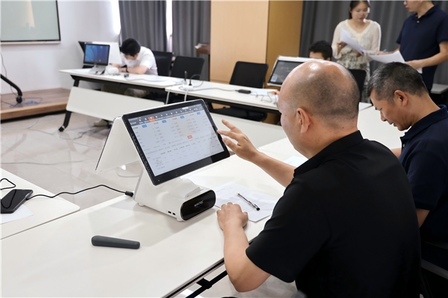 圖為姜永友與其他客戶經(jīng)理一起探討雙屏機(jī)操作 傅彪攝
