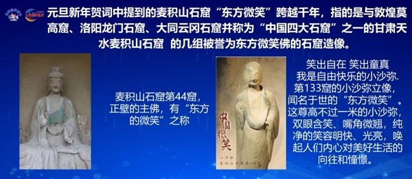2025年元旦新年賀詞中專門(mén)提到中國(guó)四大石窟之一的麥積山石窟“東方微笑”跨越千年,指的是與敦煌莫高窟、洛陽(yáng)龍門(mén)石窟、大同云岡石窟并稱為“中國(guó)四大石窟”之一的甘肅天水麥積山石窟幾組被譽(yù)為東方微笑佛的石窟造像。笑出自在,笑出童真我是自由快樂(lè)的小沙彌,第133窟的小沙彌立像,聞名于世的“東方微笑”。這尊高不過(guò)一米的小沙彌,雙眼含笑、嘴角微翹,純凈的笑容明快、光亮,喚起人們內(nèi)心對(duì)美好生活的向往和憧憬。