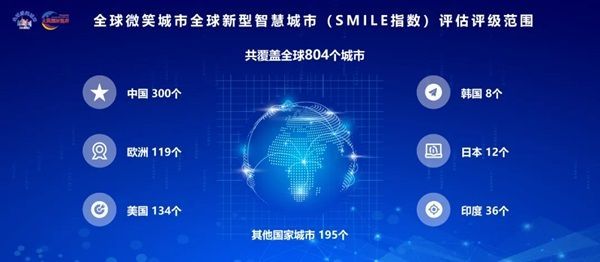 全球微笑城市暨全球新型智慧城市(SMILE指數(shù))評(píng)估評(píng)級(jí)范圍覆蓋全世界大多數(shù)國(guó)家約804個(gè)城市,包括中國(guó)300個(gè)、歐洲119個(gè)、美國(guó)134個(gè)、韓國(guó)8個(gè)、日本12個(gè)、印度36個(gè)以及其他國(guó)家城市195個(gè)。