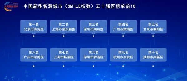 2023-2024中國(guó)新型智慧城市(SMILE指數(shù))五十強(qiáng)區(qū)前十依次為北京海淀區(qū)、上海浦東新區(qū)、深圳南山區(qū)、廣州黃埔區(qū)、北京朝陽(yáng)區(qū)、廣州越秀區(qū)、上海楊浦區(qū)、深圳羅湖區(qū)、杭州余杭區(qū)、成都高新區(qū)。