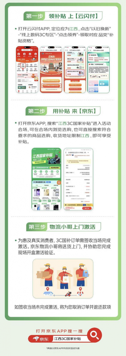 具體領(lǐng)取與使用流程為:打開云閃付APP并定位在江西,點(diǎn)擊“以舊換新”找到“線上數(shù)碼3C專區(qū)”,點(diǎn)擊領(lǐng)券,領(lǐng)取對(duì)應(yīng)品類“補(bǔ)貼資格”。領(lǐng)取后,打開京東APP搜索“江西3C國(guó)家補(bǔ)貼”進(jìn)入活動(dòng)會(huì)場(chǎng),可在會(huì)場(chǎng)內(nèi)瀏覽選購(gòu),也可直接搜索符合要求的商品選購(gòu),收貨地址限制江西,即可享受補(bǔ)貼。