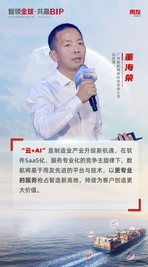 用友中子星伙伴廣州數(shù)航網(wǎng)絡(luò)科技有限公司總經(jīng)理董海榮先生分享了如何借助用友先進(jìn)的平臺(tái)與專業(yè)服務(wù),助力制造業(yè)企業(yè)實(shí)現(xiàn)數(shù)智化轉(zhuǎn)型,創(chuàng)造可持續(xù)價(jià)值。他指出,隨著數(shù)字經(jīng)濟(jì)的蓬勃發(fā)展,企業(yè)對數(shù)字化和智能化的需求迅速增長,“云+AI”正成為制造業(yè)產(chǎn)業(yè)升級(jí)的重要機(jī)遇。