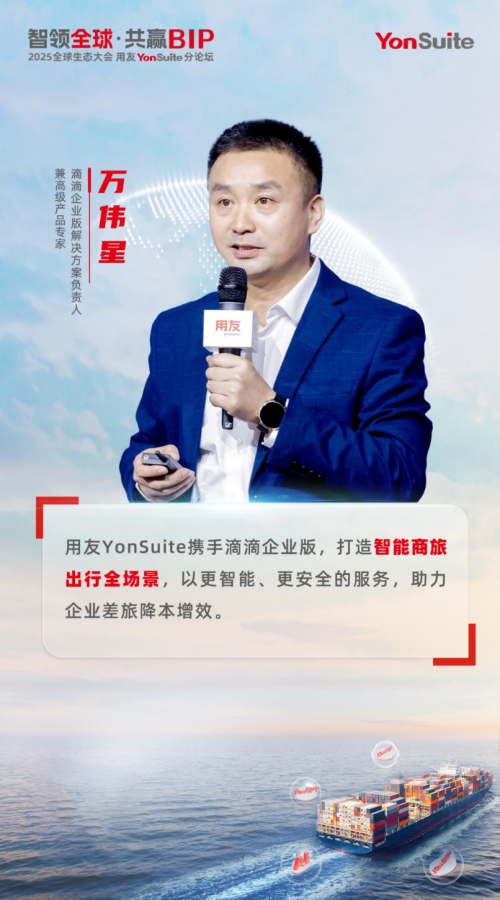 滴滴企業(yè)版解決方案負責人兼高級產(chǎn)品專家萬偉星,分享了用友YonSuite與滴滴企業(yè)版的達成戰(zhàn)略及合作后,將滴滴企業(yè)版融入YonSuite商旅云,推出了智能商旅全場景解決方案。依托滴滴日均4500萬單運力、全球覆蓋多國家服務網(wǎng)絡及SOC 2 TypeⅡ等安全認證,打造覆蓋“行前-行中-行后”的一體化商旅生態(tài),為企業(yè)提供車更多、更智能、更安全的用車服務,助力企業(yè)差旅降本增效。