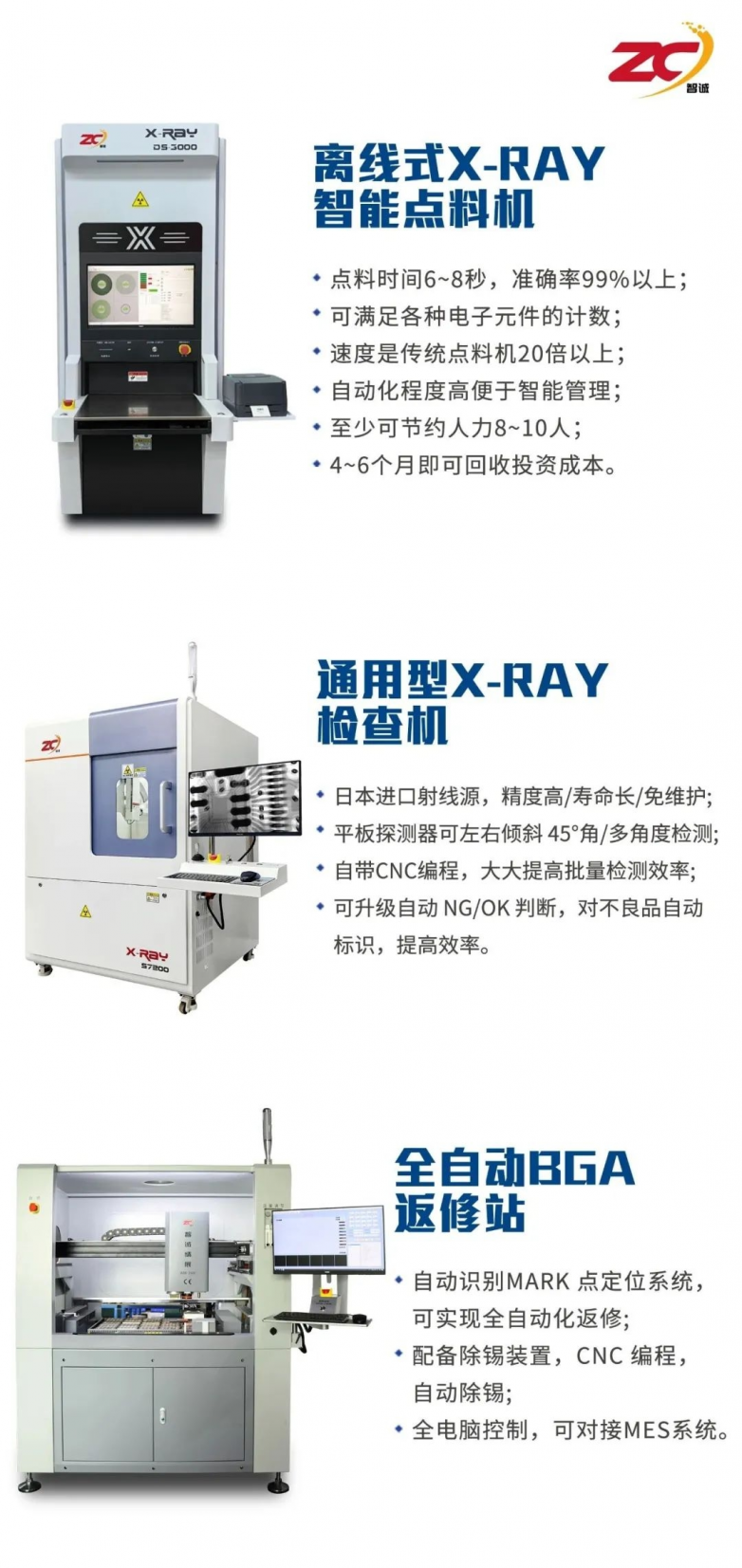 智誠精展是一家專業(yè)X-RAY檢查機(jī)、X-RAY智能點(diǎn)料機(jī)和BGA返修設(shè)備制造商。智能離線式自動點(diǎn)料機(jī),是利用X-Ray透視原理及配合自主研發(fā)具有AI功能的算法軟件,可以快速準(zhǔn)確的核算出料盤中物件的數(shù)量,同時具有自動掃碼上傳數(shù)據(jù)至MES、ERP等系統(tǒng)。通用型X-RAY檢查機(jī)是一款大型微焦點(diǎn)X射線檢測設(shè)備,適用于電子制造和半導(dǎo)體、BGA、FPC、LED、電池、鑄造等;全自動BGA返修設(shè)備是采用Mark識別精準(zhǔn)對位,適用于任何BGA芯片器件、5G服務(wù)器、特殊及高難返修元器件及大型服務(wù)器主板的返修。