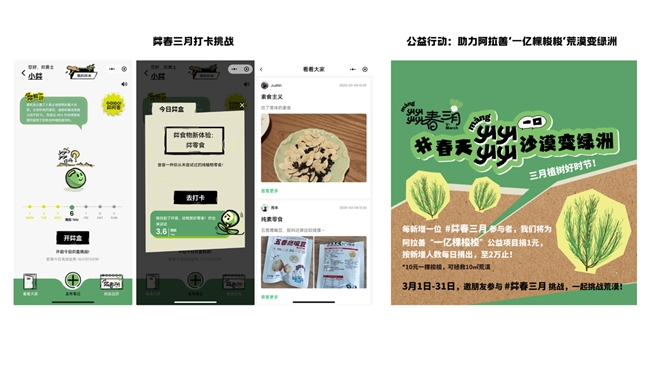 “茻春三月”關(guān)注個人健康的同時,致力于環(huán)境保護。活動期間,每新增一位打卡參與者,主辦方為阿拉善“一億棵梭梭”公益項目捐贈1元(10元可種植一棵梭梭,拯救10㎡荒漠) ,捐贈金額隨新增人數(shù)每日更新,上限2萬人。這一舉措將植物性飲食與生態(tài)保護結(jié)合,讓參與者的努力為地球帶來改變。