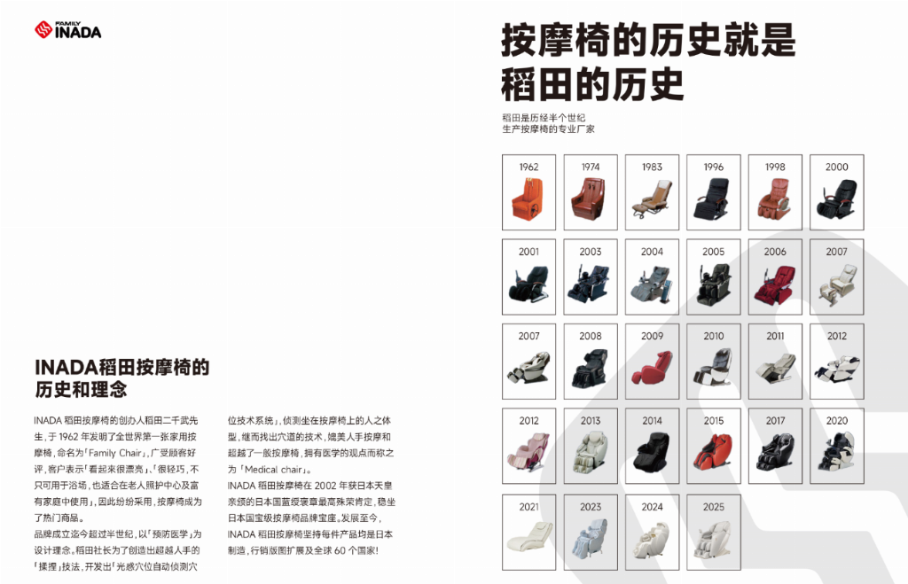 回溯到 1962 年,F(xiàn)AMILY INADA 株式會社創(chuàng)立,秉持 “更加健康化” 的座右銘,開啟了按摩椅技術(shù)的革新之旅。六十余載,在技術(shù)的更迭浪潮中,稻田按摩椅始終走在前列。從最初僅供娛樂的設(shè)施,逐步發(fā)展成為商務(wù)、家庭兩用的必備家電,它的每一步都凝聚著對技術(shù)的執(zhí)著與追求。