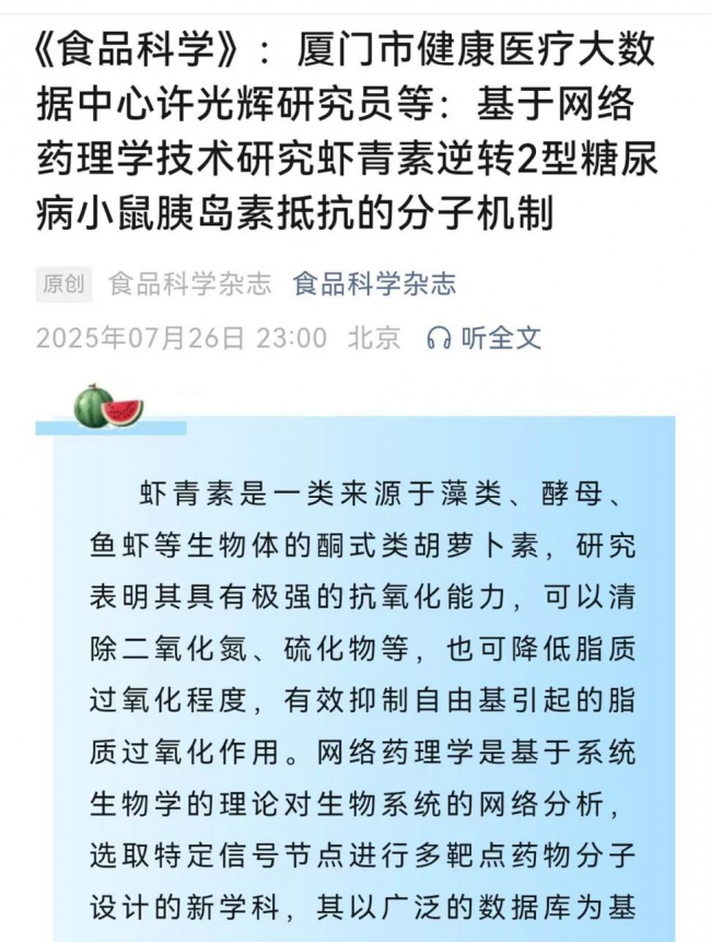 無獨有偶,2021年,俄羅斯烏拉爾聯(lián)邦大學(xué)的科學(xué)家研究發(fā)現(xiàn),蝦青素對治療糖尿病大有幫助,科技日報、中科院官網(wǎng)還對此研究成果進行了報道。烏拉爾聯(lián)邦大學(xué)研究團隊的實驗結(jié)果顯示,蝦青素不僅能顯著降低糖尿病患者的血糖水平、改善胰島功能、減少糖尿病相關(guān)并發(fā)癥,而且在預(yù)防糖尿病方面也成效顯著,能夠大幅降低糖尿病的發(fā)生風(fēng)險。該研究結(jié)果發(fā)表在《Food Sciences and Nutrition》雜志上。