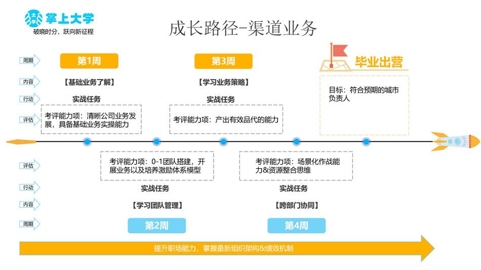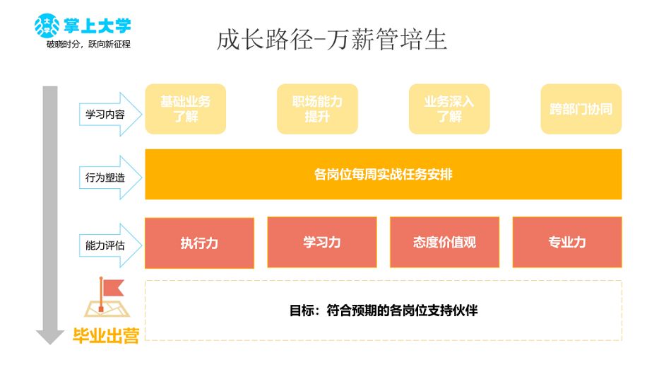 在此背景下,掌大開學(xué)營—“破曉者?暑期訓(xùn)練計劃” 開營。該計劃聚焦于萬薪 offer 管培生、城市 TL、儲備大區(qū)長等關(guān)鍵崗位人才的培養(yǎng),通過為期四周的高強度集訓(xùn),助力 40 位精英學(xué)員實現(xiàn)能力的跨越式提升。訓(xùn)練體系設(shè)計緊密貼合業(yè)務(wù)實際,第一周的 “業(yè)務(wù)基因解碼”,讓學(xué)員深入剖析公司沉淀十余年的校園渠道運營秘籍,精準(zhǔn)掌握從商家入駐到用戶轉(zhuǎn)化的每一個環(huán)節(jié),為后續(xù)業(yè)務(wù)開展奠定堅實基礎(chǔ)。第二周 “團(tuán)隊核能引爆”,培養(yǎng)0-1團(tuán)隊搭建能力,深入開展業(yè)務(wù)并著重解決團(tuán)隊在實際運營中面臨的協(xié)同難題,通過模擬各類復(fù)雜業(yè)務(wù)沖突場景,鍛煉學(xué)員在資源有限的情況下,精準(zhǔn)拆解目標(biāo)并高效執(zhí)行的能力,提升團(tuán)隊整體作戰(zhàn)效能,從而構(gòu)建出團(tuán)隊成長激勵體系模型。第三周 “策略風(fēng)暴降臨”,結(jié)合不同區(qū)域高校學(xué)生的消費特點與行為習(xí)慣,引導(dǎo)學(xué)員制定個性化的品代策略,幫助他們從單純的執(zhí)行者轉(zhuǎn)變?yōu)榫邆鋭?chuàng)新思維的業(yè)務(wù)開拓者。最后一周的 “跨域協(xié)同躍遷”,則致力于打破市場、運營、供應(yīng)鏈等部門間的協(xié)作壁壘,培養(yǎng)學(xué)員在復(fù)雜業(yè)務(wù)場景下整合各方資源的全局視野與統(tǒng)籌能力。