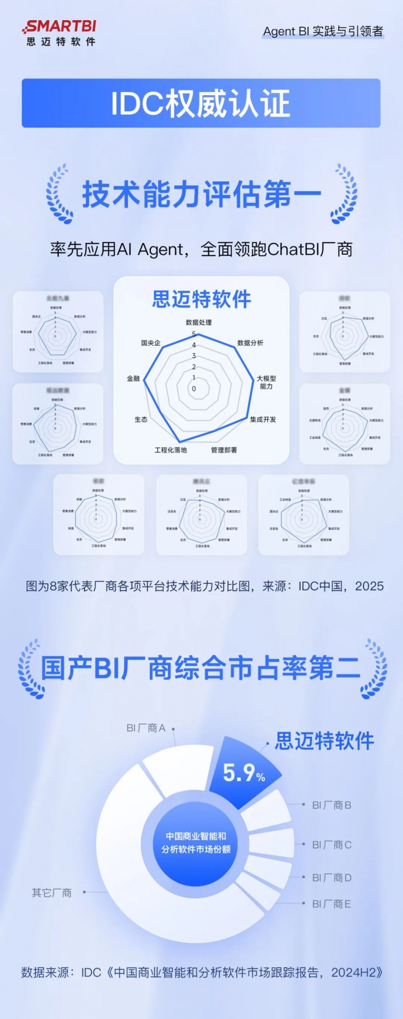 在這一積極市場趨勢下,思邁特軟件的表現(xiàn)格外引人注目。憑借領(lǐng)先的 Agent BI 架構(gòu)、深厚的行業(yè) Know-how 和出色的產(chǎn)品落地能力,思邁特在IDC GenBI技術(shù)評估中,七項平臺技術(shù)能力總分以及金融與央國企兩項行業(yè)能力總分雙雙位列第一;同時,其市場份額持續(xù)上揚,連續(xù)多周期保持高增長,穩(wěn)居國產(chǎn)BI第一陣營增長標桿。