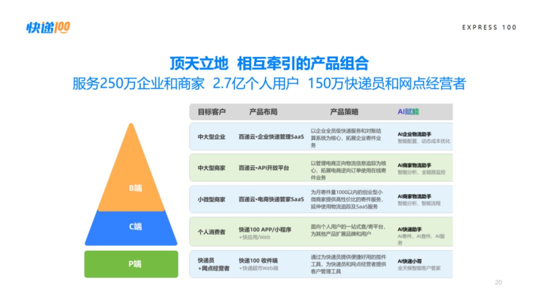 快遞100服務(wù)超2.7億C端個(gè)人用戶、150萬(wàn)P端快遞員及網(wǎng)點(diǎn)經(jīng)營(yíng)者、250萬(wàn)B端企業(yè)和商家客戶。無(wú)論 C 端、P 端還是 B 端,場(chǎng)景千變?nèi)f化,但對(duì)快遞100而言,快遞物流信息云服務(wù)的本質(zhì)是通過(guò)APP/小程序/快應(yīng)用/元服務(wù)/智能體、API、SaaS等多種形態(tài)的產(chǎn)品,將快遞物流數(shù)智基礎(chǔ)能力與場(chǎng)景服務(wù)能力分發(fā)和傳遞給C端、P端、B端等終端需求者,為個(gè)人用戶及小微商家創(chuàng)造一站式服務(wù)體驗(yàn)與聚合優(yōu)惠價(jià)值,為快遞員創(chuàng)造一站式攬收的生產(chǎn)力提效與增收價(jià)值,為企業(yè)及各類組織創(chuàng)造一體化管理與降本增效價(jià)值,為實(shí)體快遞公司創(chuàng)造平臺(tái)化訂單聚合與增量開(kāi)源價(jià)值,為快遞物流行業(yè)創(chuàng)造生態(tài)價(jià)值并注入源頭活水。