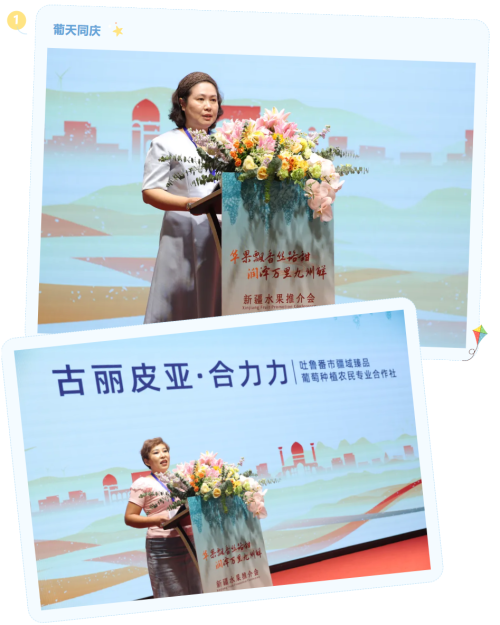 嘉興海廣興市場(chǎng)經(jīng)營管理有限公司總經(jīng)理助理徐瑛女士及吐魯番市疆域臻品葡萄種植農(nóng)民專業(yè)合作社古麗皮亞·合力力女士,分別代表采購商和當(dāng)?shù)仄髽I(yè)發(fā)言,表達(dá)了對(duì)深化合作的期待。