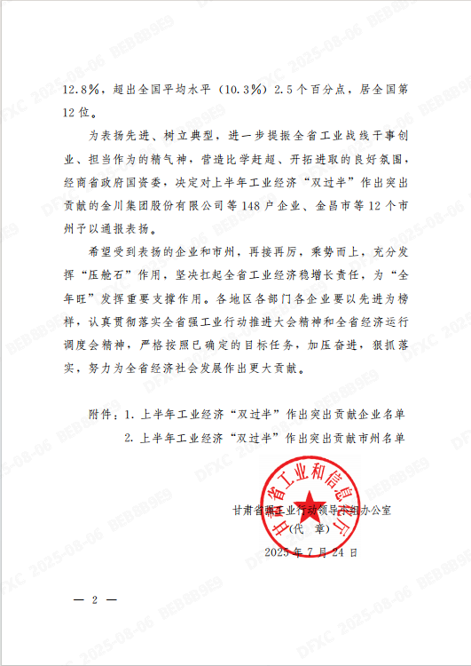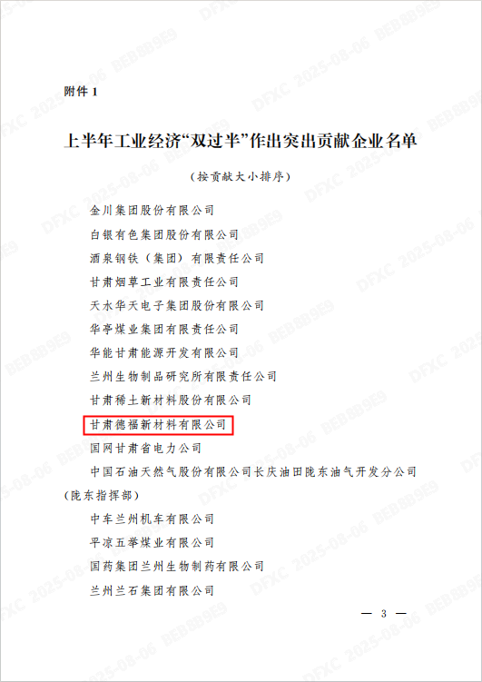 近日,甘肅省強(qiáng)工業(yè)行動(dòng)領(lǐng)導(dǎo)小組辦公室發(fā)布《關(guān)于表揚(yáng)2025年上半年全省工業(yè)經(jīng)濟(jì)“雙過半”作出突出貢獻(xiàn)企業(yè)和市州的通報(bào)》(甘工信發(fā)〔2025〕154號(hào)),九江德??萍计煜伦庸尽拭C德福新材料有限公司(以下簡(jiǎn)稱“德福新材”)憑借在推動(dòng)工業(yè)經(jīng)濟(jì)增長(zhǎng)中的卓越貢獻(xiàn),榮登通報(bào)表揚(yáng)企業(yè)名單。這一榮譽(yù)不僅是對(duì)德福新材上半年工作的權(quán)威認(rèn)可,更標(biāo)志著企業(yè)在甘肅新材料產(chǎn)業(yè)領(lǐng)域的標(biāo)桿地位進(jìn)一步凸顯。