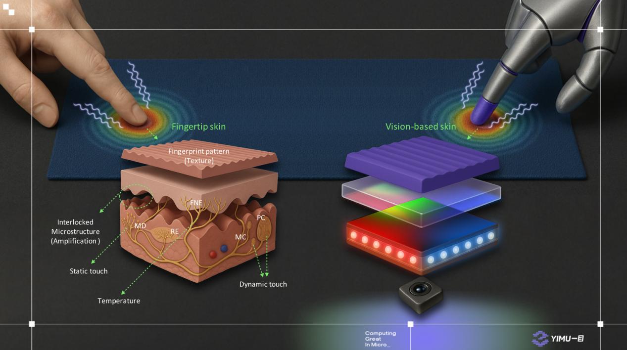 該系統(tǒng)的優(yōu)勢體現(xiàn)在三方面:一是通用接口設(shè)計,可與VLA大模型及觸覺模型集成,構(gòu)建VTLA大模型體系,快速接入前沿算法;二是傳感器芯片化創(chuàng)新,通過微型化與低功耗技術(shù)提升觸覺信號的保真度;三是材料學(xué)突破,團隊研發(fā)的“仿生皮膚”在耐久性與感知特性上趨近人類指尖,支撐長時間、高精度操作。