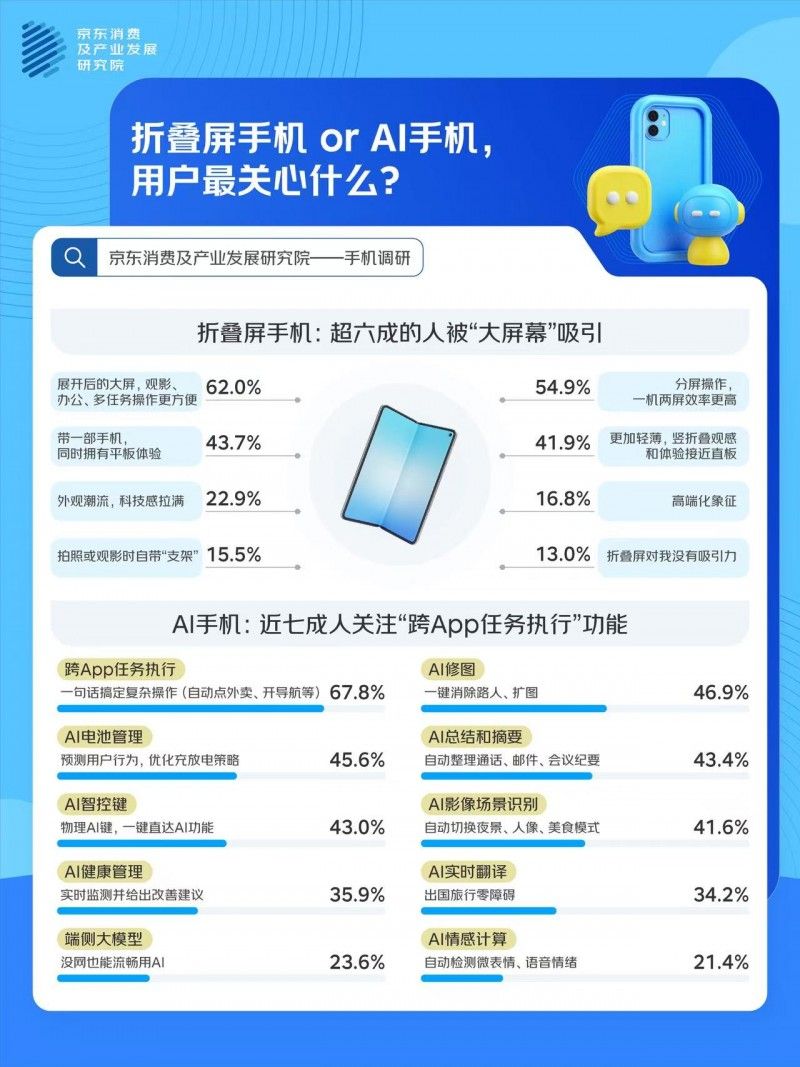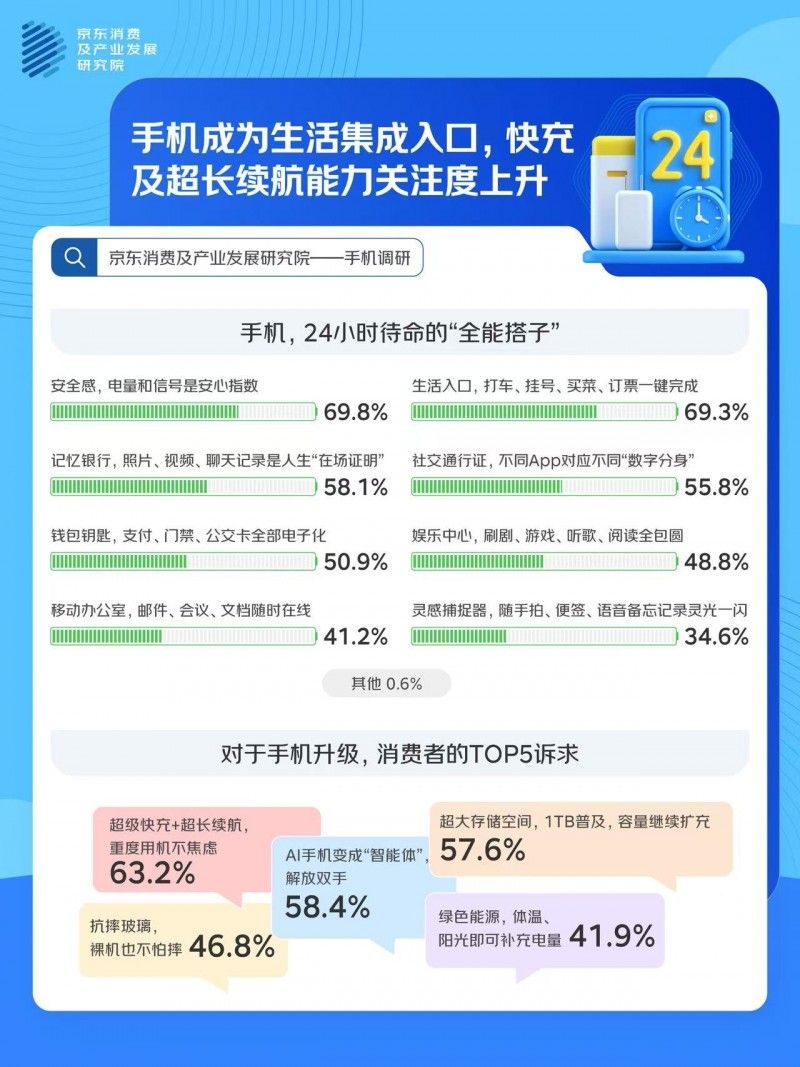 手機(jī)已經(jīng)從通訊工具成為了生活的集成入口,消費(fèi)者對(duì)手機(jī)功能的需求和選擇也在不斷發(fā)生變化,近日,京東消費(fèi)及產(chǎn)業(yè)發(fā)展研究院聯(lián)合京洞察發(fā)起調(diào)研,通過與1000位消費(fèi)者的對(duì)話,了解手機(jī)使用習(xí)慣變化、形態(tài)偏好、換新訴求及迭代期待,調(diào)研結(jié)果顯示: