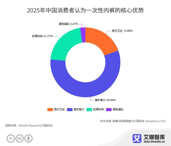 中國(guó)消費(fèi)者的衛(wèi)生意識(shí)與便捷訴求正經(jīng)歷質(zhì)的飛躍。iiMedia Research(艾媒咨詢)數(shù)據(jù)顯示,超50%的消費(fèi)者認(rèn)為一次性內(nèi)褲的核心優(yōu)勢(shì)在于省時(shí)省力,其次是“輕便收納”(21.21%)和“絕對(duì)衛(wèi)生”(19.48%)。