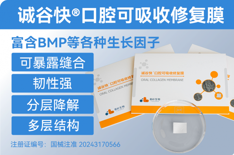 誠谷快?口腔可吸收修復(fù)膜(韌性膠原膜),產(chǎn)品四大核心優(yōu)勢:可暴露縫合、韌性強、分層降解(多層結(jié)構(gòu))、促成骨。作為易嶺生物專利技術(shù)的結(jié)晶(專利號: ZL 2021 10090689.1),產(chǎn)品實現(xiàn)了從原料到成品的直接轉(zhuǎn)化:在保證屏障效果的同時,易嶺生物在制作工藝上進行了創(chuàng)新,研發(fā)出了直接利用動物源生物膜制備的口腔修復(fù)膜及其制備方法,該方法直接對動物源生物膜材料進行一系列處理制備得到口腔修復(fù)膜材料,不使用任何交聯(lián)劑,創(chuàng)新清洗技術(shù),能夠大大減少生產(chǎn)操作流程,縮短生產(chǎn)周期,降低了患者的治療成本,讓更多患者可以受惠于科技成果。另外,誠谷快?韌性膠原膜具有獨特的多層結(jié)構(gòu)設(shè)計,能實現(xiàn)分層降解,具有長達3個月的屏障作用,有效引導(dǎo)骨再生并防止軟組織長入,且可完全降解,無需進行二次手術(shù),解決了膜暴露可能引發(fā)的感染等并發(fā)癥這一臨床難題。