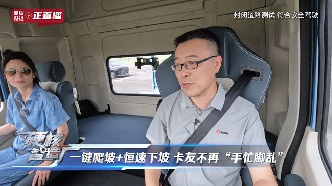 展新副總經(jīng)理親自駕駛,帶領央視主持人體驗了乘龍翼威5的高速行駛、“一鍵爬坡+恒速下坡”功能以及強化壞路測試等多項性能,讓觀眾直觀領略到乘龍翼威5的強勁動力與卓越智能制動控制表現(xiàn)。