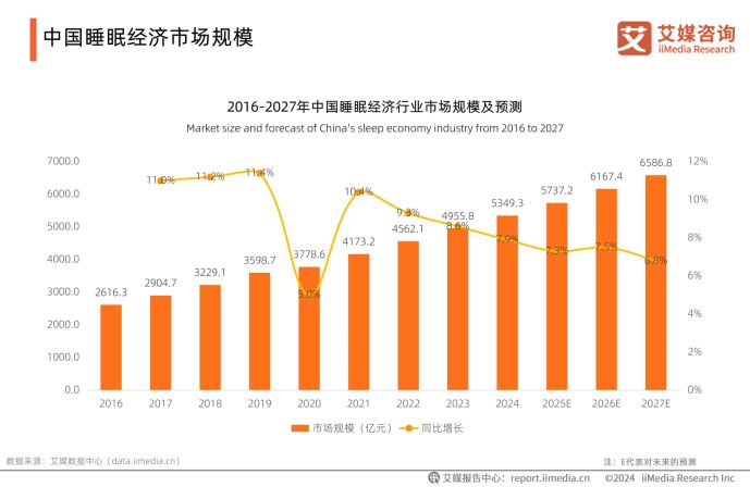 近年來,中國睡眠經(jīng)濟(jì)正以迅猛態(tài)勢發(fā)展,而背后是國民普遍的睡眠需求驅(qū)動。iiMedia Research(艾媒咨詢)數(shù)據(jù)顯示,超九成國民經(jīng)?;蚺紶枙霈F(xiàn)睡眠質(zhì)量問題,睡眠淺、入睡困難、易醒等問題成為困擾國民的主要難題。在需求驅(qū)動下,中國睡眠經(jīng)濟(jì)市場規(guī)模從2016年的2616.3億元增長至2024年的5349.3億元。隨著睡眠產(chǎn)品市場滲透率不斷提高,產(chǎn)品類型不斷增多,預(yù)計2027年中國睡眠經(jīng)濟(jì)市場規(guī)模將達(dá)6586.8億元,龐大的市場需求為睡眠相關(guān)企業(yè)帶來了廣闊的發(fā)展空間。