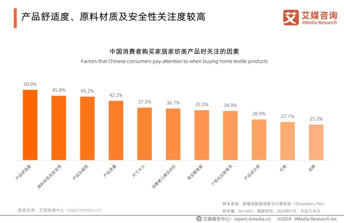 在睡眠產(chǎn)品消費偏好上,消費者對睡眠產(chǎn)品的選擇更趨品質(zhì)化。iiMedia Research(艾媒咨詢)數(shù)據(jù)顯示,56.8%的人傾向通過家居家紡類產(chǎn)品改善睡眠,其中床墊(54.8%)、睡覺抱枕(50.0%)是熱門選擇;購買時,五成消費者優(yōu)先關(guān)注舒適度,原料安全性、產(chǎn)品功能性等也成為核心考量,這反映出市場對高品質(zhì)睡眠產(chǎn)品的需求升級。