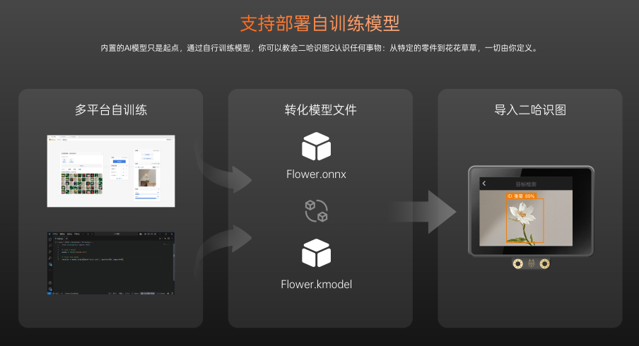 導(dǎo)出部署:支持將模型部署至二哈識(shí)圖2、行空板等硬件設(shè)備。