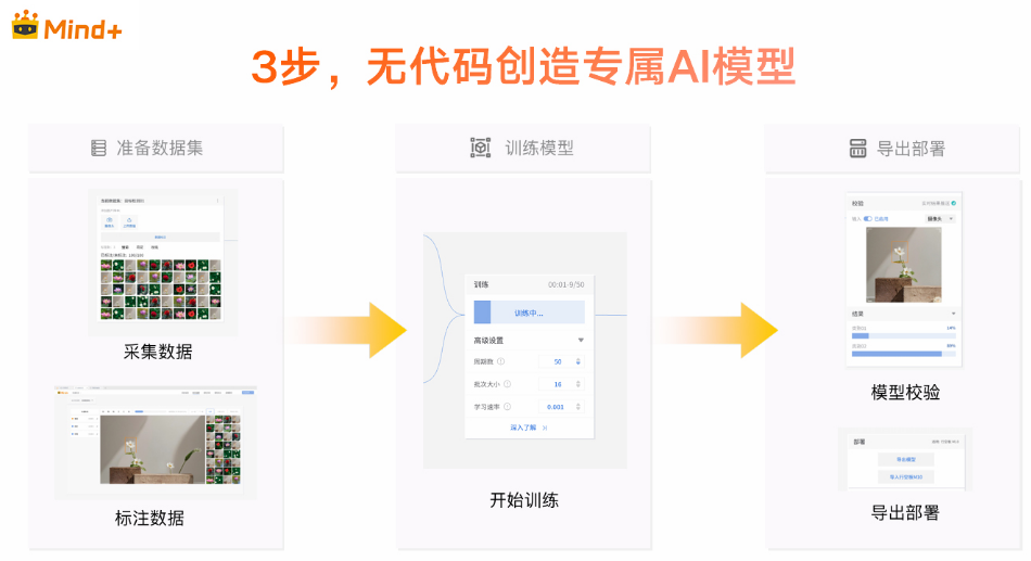 復(fù)雜的環(huán)境配置、繁瑣的訓(xùn)練流程常常讓AI學(xué)習(xí)者望?卻步。為此,Mind+推出了全新的模型訓(xùn)練?具,將模型訓(xùn)練的流程提煉為簡(jiǎn)單三步: