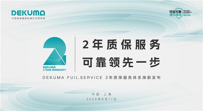 2025年9月17日,中國國際橡膠技術(shù)展覽會現(xiàn)場。德科摩以“2年質(zhì)保服務(wù) · 可靠領(lǐng)先一步”為主題,煥新發(fā)布DEKUMA FULL SERVICE 2年質(zhì)保服務(wù)體系。該服務(wù)體系的煥新發(fā)布,代表著高端橡塑裝備行業(yè)質(zhì)保時(shí)限跨入“2”時(shí)代。這是德科摩堅(jiān)持以客戶為中心,踐行可信可靠品牌承諾的又一重大舉措。