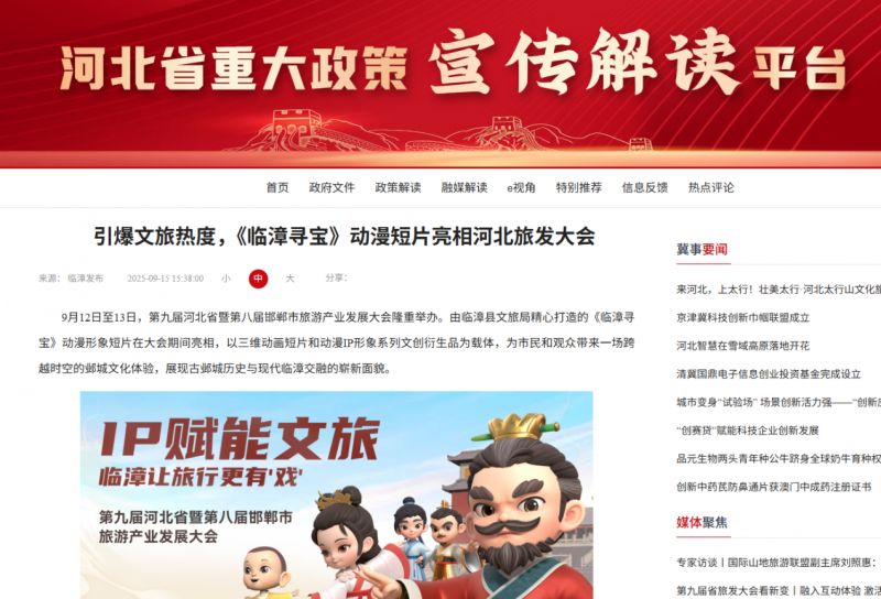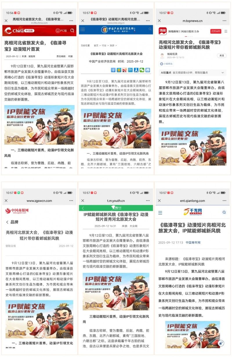 《臨漳尋寶》IP自發(fā)布以來(lái),便以其獨(dú)特的歷史文化底蘊(yùn)和創(chuàng)新的現(xiàn)代表現(xiàn)形式吸引了眾多關(guān)注。在本次旅游產(chǎn)業(yè)發(fā)展大會(huì)上,更是獲得了廣泛媒體支持。新華網(wǎng)、中國(guó)日?qǐng)?bào)、中國(guó)網(wǎng)、環(huán)球時(shí)報(bào)、中國(guó)發(fā)展網(wǎng)、長(zhǎng)城網(wǎng)、河青新聞網(wǎng)等數(shù)十家央級(jí)及河北省級(jí)權(quán)威媒體報(bào)道,同步在騰訊新聞、搜狐新聞、今日頭條、百度百家等主流新媒體平臺(tái)發(fā)布,覆蓋新聞門(mén)戶、視頻平臺(tái)、社交媒體等多維渠道,形成立體化傳播矩陣。