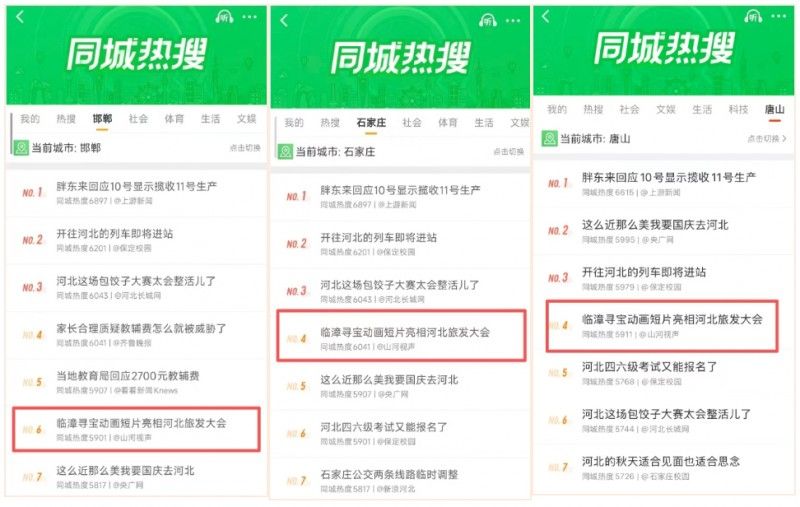 除此之外,《臨漳尋寶》在抖音、微博、主流內(nèi)容平臺(tái)同樣引發(fā)廣泛討論。相關(guān)微博話題#臨漳尋寶動(dòng)畫(huà)短片亮相河北旅發(fā)大會(huì)# 上榜河北全省11個(gè)地級(jí)市微博同城熱搜榜,話題閱讀量2157.8萬(wàn)。相關(guān)抖音話題#臨漳尋寶 獲得超2000萬(wàn)曝光量。網(wǎng)友紛紛表示“被萌到了”“想去臨漳打卡”。
