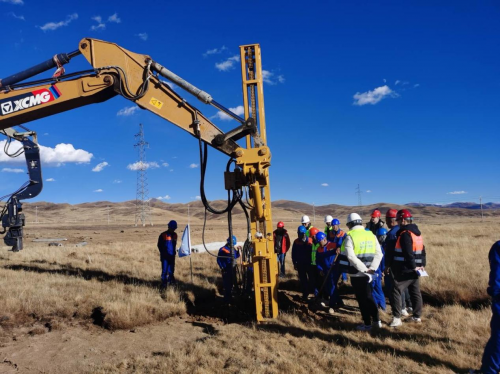項(xiàng)目建設(shè)過程中,面臨著高海拔、極寒天氣帶來的多重挑戰(zhàn)。項(xiàng)目地處海拔4000米區(qū)域,平均氣溫低至-20℃,施工現(xiàn)場凍土層深厚,打樁作業(yè)難度極大,如同“在石頭上插筷子”,精度和穩(wěn)定性控制難度高,嚴(yán)重影響施工進(jìn)度。為攻克這一難題,中建八局項(xiàng)目團(tuán)隊(duì)多次開展實(shí)驗(yàn),最終決定選用PHC管樁代替?zhèn)鹘y(tǒng)灌注樁,在提升樁基穩(wěn)定性的同時(shí)加快施工進(jìn)度。同時(shí),團(tuán)隊(duì)采用履帶式高原打樁機(jī),并搭配三維可視化管樁定位技術(shù),大幅提升施工效率與精度。憑借科學(xué)的施工方案和高效的執(zhí)行能力,項(xiàng)目團(tuán)隊(duì)僅用128天就完成了46299根基礎(chǔ)樁、5427組支架與組件、13.86公里集電線路、1000公里低壓直流線路、44公里低壓交流線路、34臺(tái)箱變、373臺(tái)逆變器、1臺(tái)站用變、1座匯集站以及7.35公里新建道路的建設(shè)任務(wù),創(chuàng)造了高海拔地區(qū)新能源項(xiàng)目建設(shè)的高效典范。