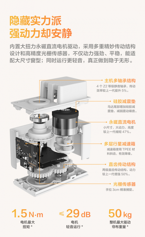 Aqara 智能隱形窗簾電機(jī) C200 內(nèi)置 1.5N·m 大扭矩永磁直流電機(jī),最大可承重 50kg 簾布,動(dòng)力強(qiáng)勁,運(yùn)行噪音低至 29dB,達(dá)到睡眠級輕音水準(zhǔn)。
