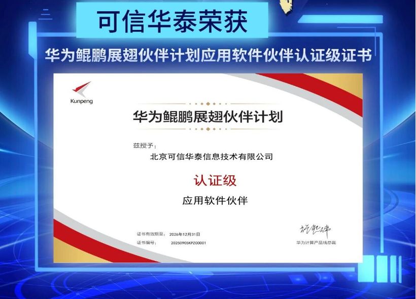 可信華泰近日宣布榮獲“華為鯤鵬展翅伙伴計劃”認證