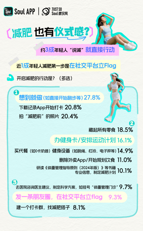 從想減肥到行動(dòng),隔著重重阻礙,如何邁出重要的第一步?27.8%的年輕人“想到就做”,直接開(kāi)始跑步、控制飲食等減肥行動(dòng);20.4%的減肥人會(huì)先拍張減肥前照片,方便后續(xù)對(duì)比;14.9%則先買(mǎi)再說(shuō),必須下單代餐、運(yùn)動(dòng)衣、器械等減肥產(chǎn)品,把儀式感直接拉滿。