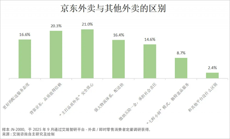 調(diào)研中,京東顯然具有明顯優(yōu)勢(shì),提到京東外賣與其他外賣的區(qū)別,21%的用戶認(rèn)為是“主打品質(zhì)外賣,安全放心”, 20.3%的用戶覺得“背靠京東電商平臺(tái),品質(zhì)保障,值得信賴”,16.6%認(rèn)為“有更好的配送服務(wù)態(tài)度”,這些用戶眼中的差異,已經(jīng)轉(zhuǎn)化為真實(shí)的選擇偏好,也意味著京東外賣以“信任”為核心的品質(zhì)化路線,不僅讓其在市場中站穩(wěn)了腳跟,也為行業(yè)樹立了“價(jià)值競爭”的標(biāo)桿。