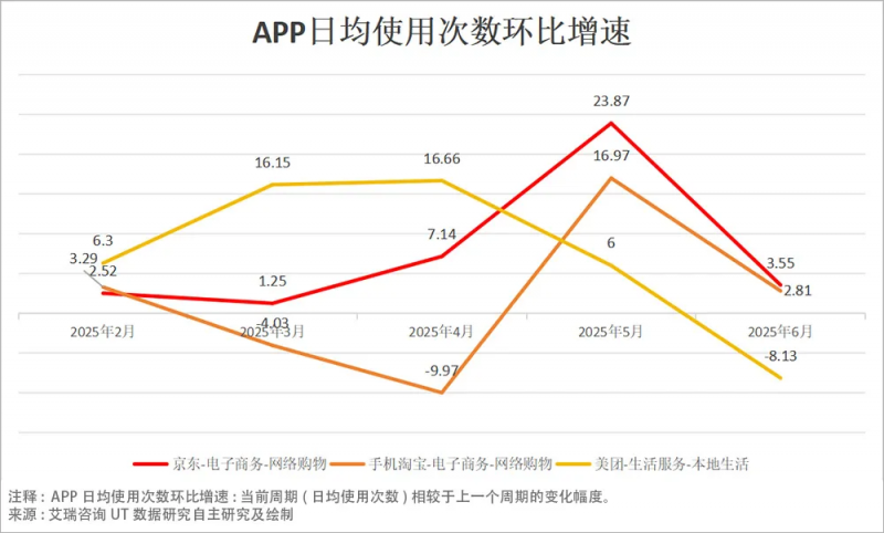 數(shù)據(jù)顯示,今年4月,美團(tuán)APP日均使用次數(shù)環(huán)比增速為16.66%,處于領(lǐng)先位置,緊接著,關(guān)鍵轉(zhuǎn)變?cè)?月份發(fā)生,京東以23.87%的高增速領(lǐng)跑全行業(yè),淘寶緊跟其后環(huán)比增長16.97%,而美團(tuán)增速滑落至6%。結(jié)果顯而易見,2025年5月,外賣補(bǔ)貼帶動(dòng)市場重新洗牌。