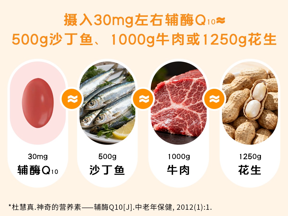 然而,人體內(nèi)輔酶Q10的水平會因年齡增長、壓力及疾病等因素而逐漸下降[2]。雖然可從膳食中攝取,但日常食物中輔酶Q10含量低。例如,要攝入30mg左右輔酶Q10,大約需要食用500g沙丁魚、1000g牛肉或1250g花生[3]。而且,烹飪會破壞營養(yǎng),加上現(xiàn)代人飲食結構不均衡,導致日常攝入量與機體需求存在差距。因此,適時、定量補充輔酶Q10十分必要。