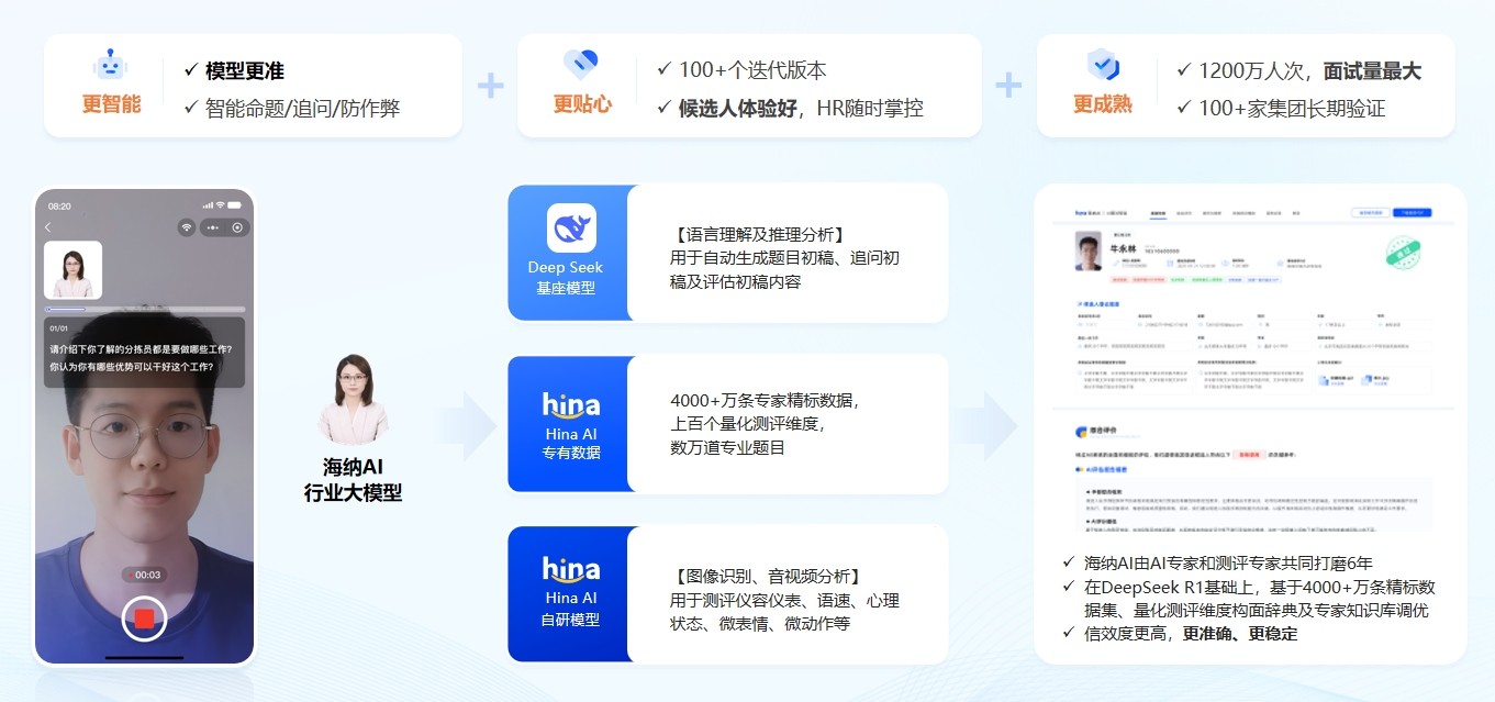 ·AI面試量最大:海納AI服務(wù)了5000多家企業(yè)客戶,其中包括100多家500強(qiáng)集團(tuán),累計(jì)面試超1200萬人次,在快遞、制造、零售、餐飲等行業(yè)沉淀了1000+崗位模型。