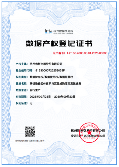 在此過程中,老板電器率先實現(xiàn)數(shù)據產權的重要突破。在“中國數(shù)谷”成果發(fā)布會上,老板電器一舉獲批7張數(shù)據產權登記證書,成為首批企業(yè)中獲證數(shù)量最多的單位,率先完成了“產權明晰化”的關鍵一步,這也標志著其在數(shù)據要素市場的探索已從“先行”邁入“領軍”階段。對于老板電器而言,這些證書如同為其數(shù)據資產量身定制的“身份證”,首次實現(xiàn)數(shù)據持有權、使用權、經營權的“三權合一”,使包括熱量精準識別圖譜、菜譜營養(yǎng)與健康價值關系數(shù)據等在內的企業(yè)核心數(shù)據產品,從“沉默資源”轉化為具有法律初步證據效力的“創(chuàng)新資產”。