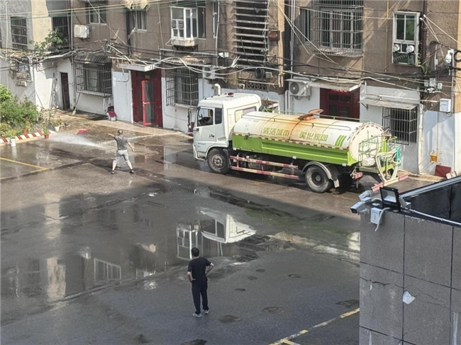 (圖為清理院內(nèi)淤泥、消殺防疫工作 張攀攝)