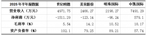 從數(shù)據(jù)來看,中凱國際在多個維度表現(xiàn)優(yōu)異,不僅營收規(guī)模最高,還是唯一實現(xiàn)盈利的公司,同時擁有最高的毛利率和最健康的資產(chǎn)負債率,顯示出強勁的綜合實力。世紀明德營收排名第二,但面臨嚴重的經(jīng)營和財務(wù)壓力,凈利潤虧損嚴重且資產(chǎn)負債率超過100%,存在資不抵債的風險。美育股份和明珠國際均出現(xiàn)虧損,但財務(wù)狀況相對穩(wěn)定,其中明珠國際的虧損幅度最小。