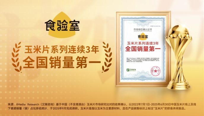 近期,食驗(yàn)室獲全球領(lǐng)先的新經(jīng)濟(jì)產(chǎn)業(yè)第三方數(shù)據(jù)挖掘和分析機(jī)構(gòu)iiMedia Research(艾媒咨詢)授予的“玉米片系列連續(xù)3年全國(guó)銷量第一”市場(chǎng)地位確認(rèn)。