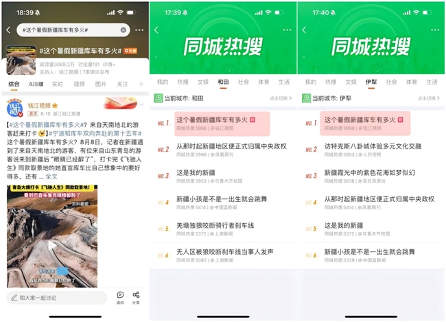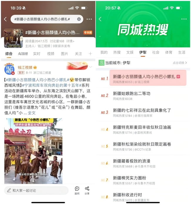 #這個暑假新疆庫車有多火#、#新疆小古麗顏值人均小熱巴小娜扎#登上全疆熱搜第一位,閱讀量合計(jì)超5100萬。