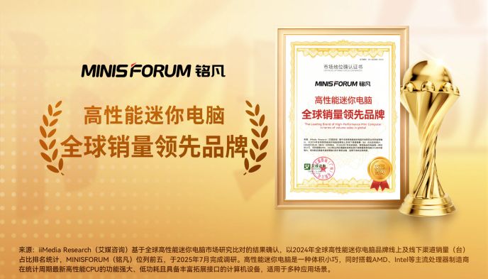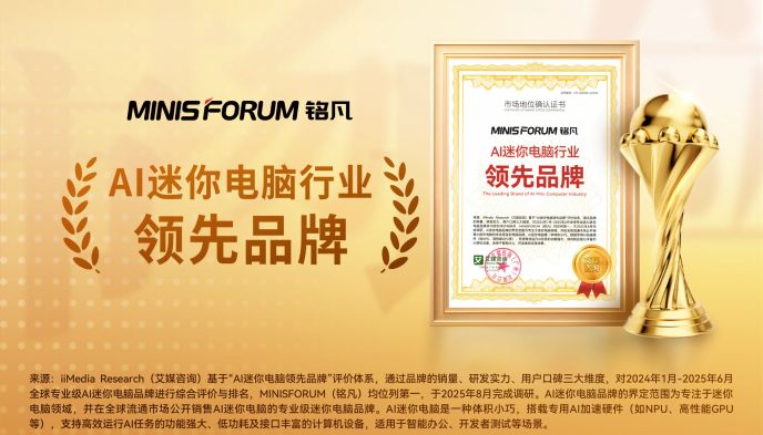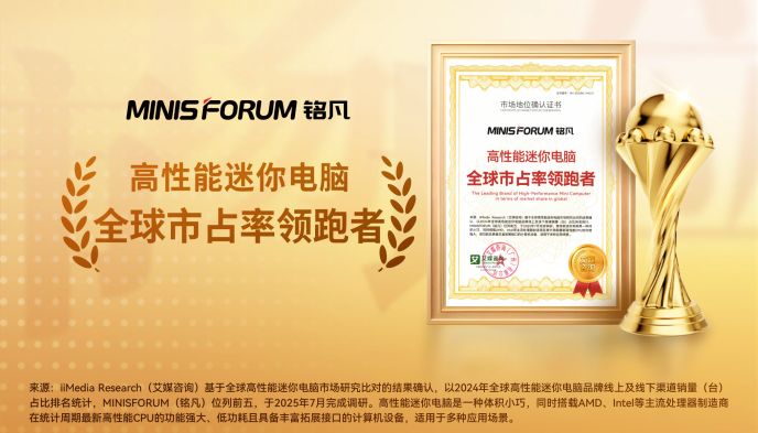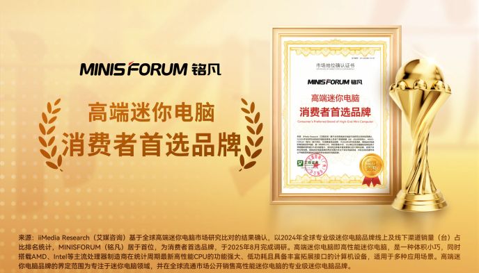 基于艾媒自主研發(fā)并獲得省部級(jí)重大科技專(zhuān)項(xiàng)立項(xiàng)的CMDAS大數(shù)據(jù)系統(tǒng)監(jiān)測(cè)及嚴(yán)格的調(diào)查,以及對(duì)中國(guó)(不含港澳臺(tái))高性能迷你電腦行業(yè)研究比對(duì)的結(jié)果進(jìn)行統(tǒng)計(jì)確認(rèn),銘凡榮獲全球領(lǐng)先的新經(jīng)濟(jì)產(chǎn)業(yè)第三方數(shù)據(jù)挖掘和分析機(jī)構(gòu)iiMedia Research(艾媒咨詢)授予的“高性能迷你電腦全球市占率領(lǐng)跑者”“AI迷你電腦全球創(chuàng)新領(lǐng)導(dǎo)品牌”“AI迷你電腦行業(yè)第一品牌”“AI迷你電腦行業(yè)領(lǐng)先品牌”“高性能迷你電腦全球銷(xiāo)量領(lǐng)先品牌”“高端迷你電腦消費(fèi)者首選品牌”市場(chǎng)地位確認(rèn)。