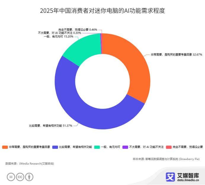 人工智能技術(shù)的融合正在成為迷你電腦行業(yè)最重要的技術(shù)趨勢(shì)。2025年,迷你電腦若無(wú)AI算力,幾乎失去上桌資格——iiMedia Research(艾媒咨詢)調(diào)研數(shù)據(jù)顯示,超八成的消費(fèi)者對(duì)迷你電腦的AI功能非常需要,是購(gòu)買(mǎi)的重要考量因素。