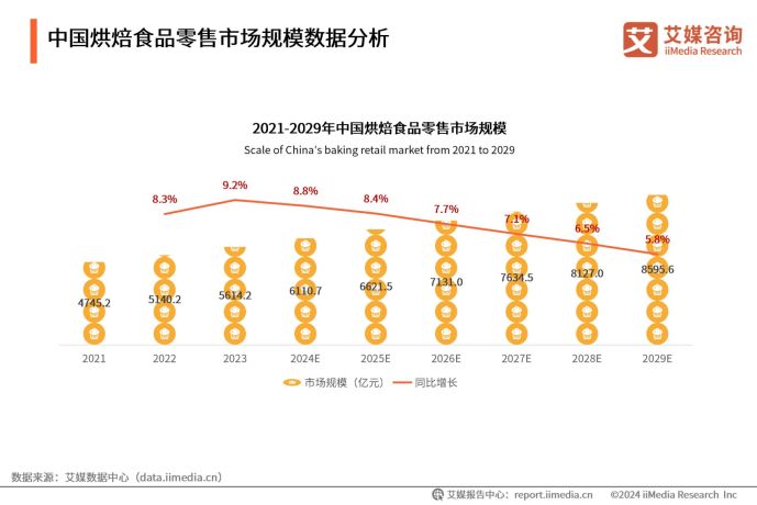 在健康消費(fèi)升級(jí)與烘焙行業(yè)結(jié)構(gòu)性變革的雙重驅(qū)動(dòng)下,全麥面包賽道近年來呈現(xiàn)出爆發(fā)式增長態(tài)勢(shì)。iiMedia Research(艾媒咨詢)數(shù)據(jù)顯示,2024年中國烘焙食品零售市場(chǎng)規(guī)模已達(dá)到6110.7億元,預(yù)計(jì)2025年中國烘焙食品零售市場(chǎng)規(guī)模達(dá)6621.5億元,同比增長8.4%。伴隨人均消費(fèi)能力的提升與餐飲消費(fèi)結(jié)構(gòu)的優(yōu)化,中國烘焙食品零售市場(chǎng)正迎來持續(xù)擴(kuò)容的發(fā)展態(tài)勢(shì),預(yù)計(jì)到2029年可達(dá)8595.6億元。