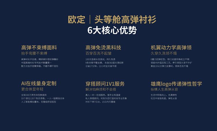 產(chǎn)品功能層面,歐定采用高彈不束縛面料,結(jié)合高彈免燙黑科技與機(jī)翼動(dòng)力學(xué)高彈領(lǐng),確保著裝的高彈、舒適與有型;在服務(wù)體驗(yàn)層面,歐定通過AI定制、AI試衣及1對(duì)1穿搭顧問等智能化、個(gè)性化服務(wù),為商務(wù)精英解決穿衣痛點(diǎn)。彈性既是歐定產(chǎn)品的核心功能屬性,也是歐定獨(dú)特的價(jià)值主張,歐定以服裝為媒介,將“高彈性”從面料物性升維為當(dāng)代精英的生活哲學(xué),開創(chuàng)“彈性文化”。這些優(yōu)勢(shì)共同構(gòu)建起歐定在高端襯衫市場(chǎng)的護(hù)城河,也為其在智能服裝領(lǐng)域的持續(xù)拓展奠定基礎(chǔ)。