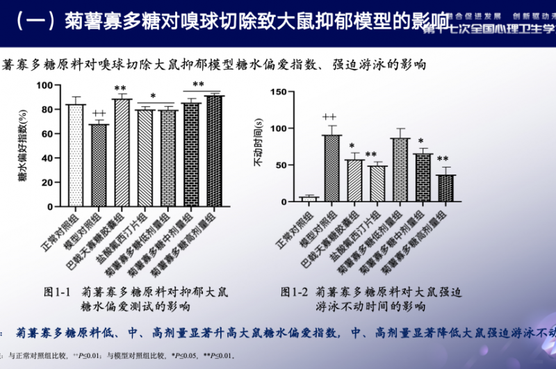 李安寧醫(yī)生在報告中指出,多項動物實驗驗證了菊薯寡多糖的抗抑郁效果。在嗅球切除大鼠和慢性應激小鼠模型中,菊薯寡多糖顯著提升動物對糖水的偏好度,改善“快感缺失”癥狀;在大鼠強迫游泳測試及小鼠懸尾實驗中,有效縮短動物不動時間,緩解“行為絕望”表現(xiàn)。研究證實,這些改善作用并非源于活動量變化,而是精準作用于抑郁與焦慮的核心癥狀。